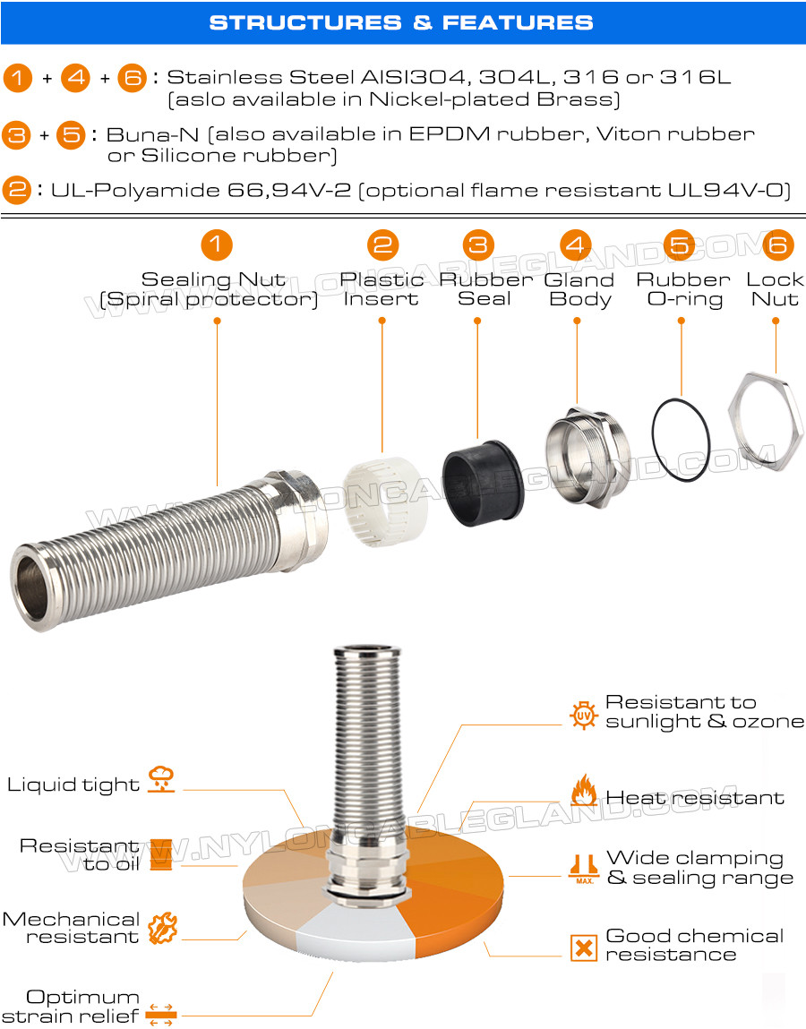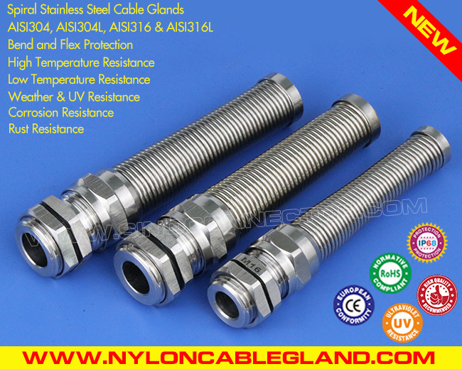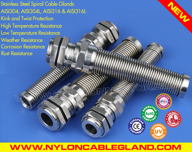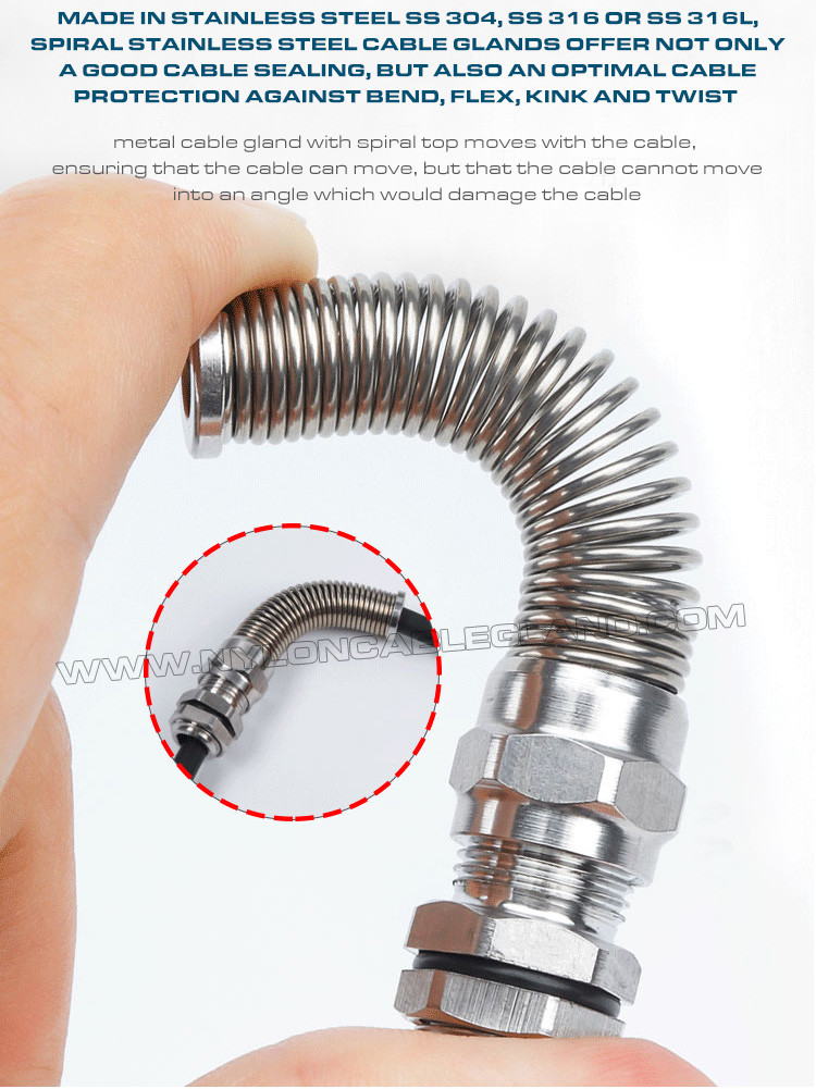 Dzięki zaletom dużej odporności na uderzenia i szerokiemu zakresowi mocowania, odporności na wysokie i niskie temperatury oraz odporności na warunki atmosferyczne, hermetyczne metryczne dławiki kablowe spiralne IP68 M12 ~ M50 ze stali nierdzewnej typu 304/316/316L z zabezpieczeniem przed załamaniem i zgięciem - są dostarczane z dodatkowym spiralna sprężyna ochronna i ma zdolność odporności chemicznej, odporności na korozję i odporności na ciepło, a także ma zdolność wysokiej wytrzymałości na rozciąganie, dużej wytrzymałości na rozciąganie, dobrej wodoodporności, doskonałej ochrony przed zginaniem i długiego czasu użytkowania.