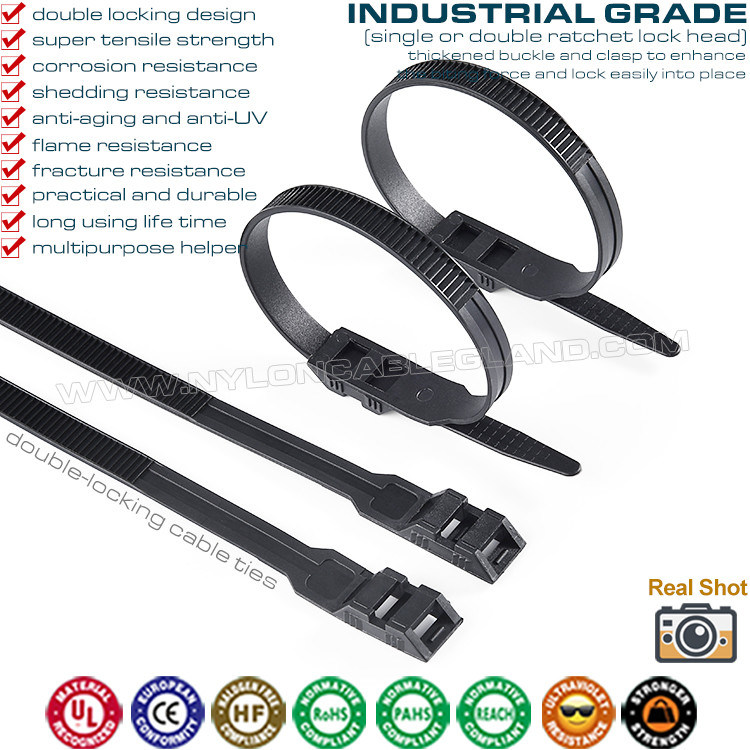 Ząbkowana na zewnątrz opaska kablowa z podwójną blokadą stanowi dodatkowy zamek w stosunku do zwykłej opaski kablowej z blokadą równoległą, tworząc mechanizm podwójnej blokady. Konstrukcja z podwójnym zamkiem sprawia, że opaska kablowa jest mocniejsza i bezpieczniejsza w użyciu oraz może zapobiec przypadkowemu otwarciu lub poluzowaniu. Nadaje się do scenariuszy zastosowań o wysokich wymaganiach bezpieczeństwa, takich jak lotnictwo, samochody i inne dziedziny.